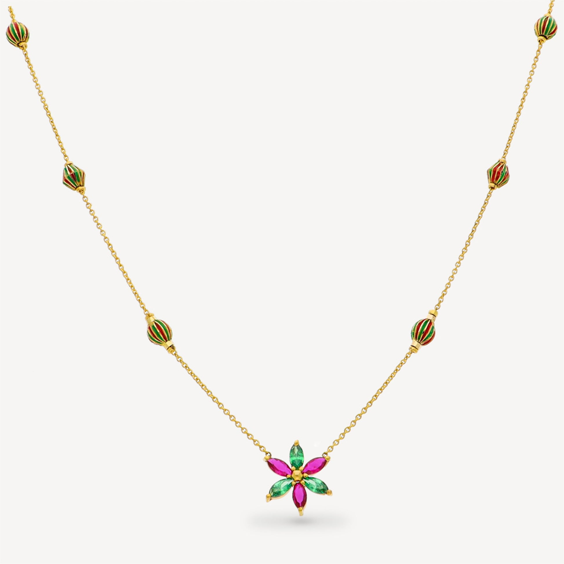 A vibrant blend of color and tradition — this gold necklace features enamelled elements in pink and green, with playful accents along the chain. Lightweight and festive, it’s perfect for adding a joyful pop to any outfit.